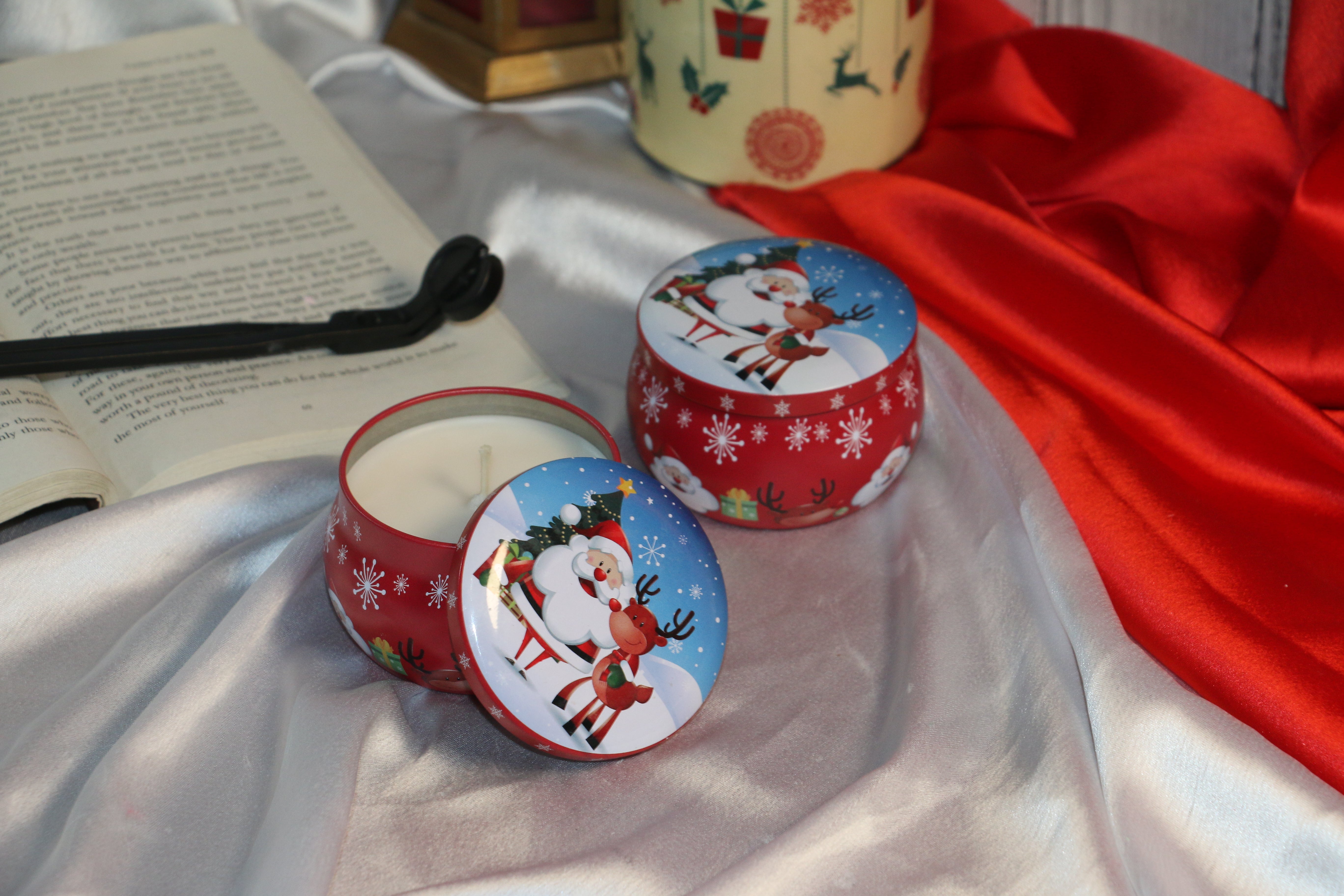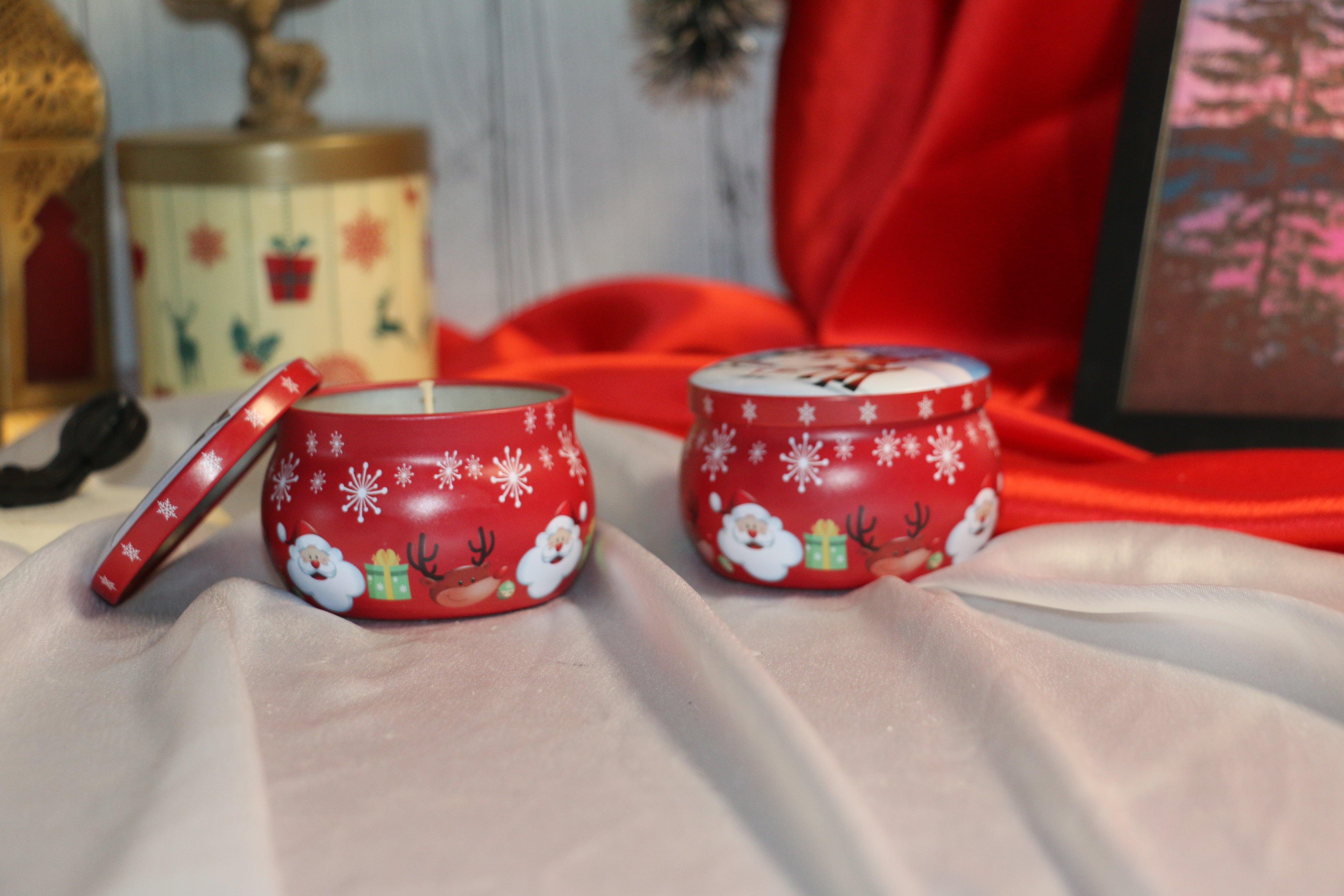 Light up your holidays with our limited-edition Christmas scented candle tins, crafted to fill your space with warmth, joy, and festive cheer. Each candle is made with premium imported golden soy wax — clean-burning, long-lasting, and eco-friendly — poured into high-quality imported tins that are sturdy, reusable, and beautifully printed with exclusive Christmas designs.