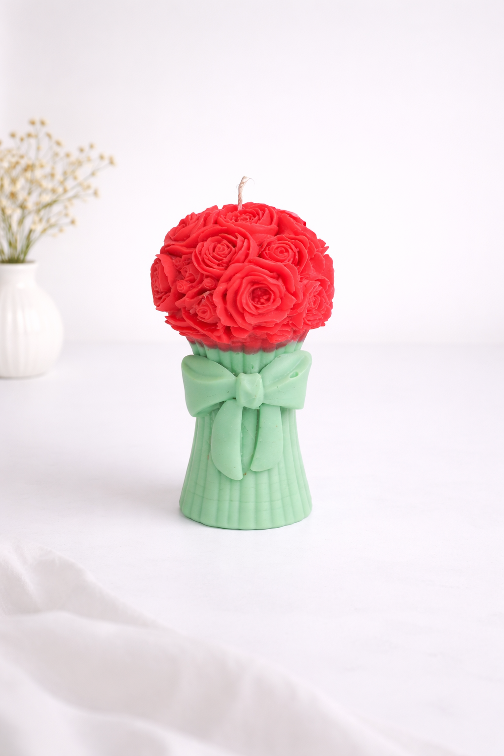 Bring together the beauty of flowers and the warmth of candles with our Wax Flower Bouquet Candle, a stunning structured candle designed in the shape of a natural bouquet. Featuring red rose-style flowers on top and a green bouquet base, this candle looks incredibly realistic and elegant — just like a fresh flower arrangement, but made entirely of wax.