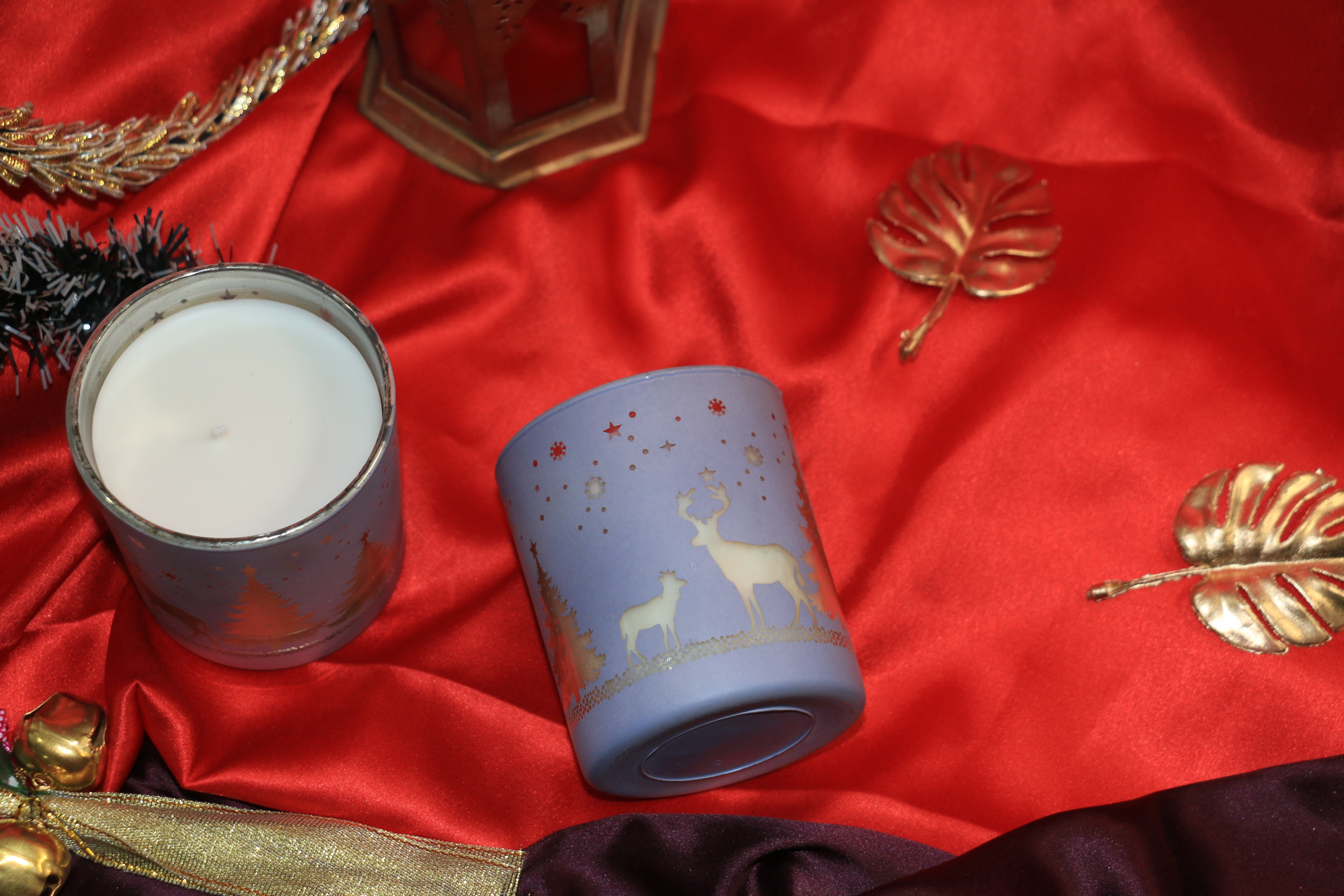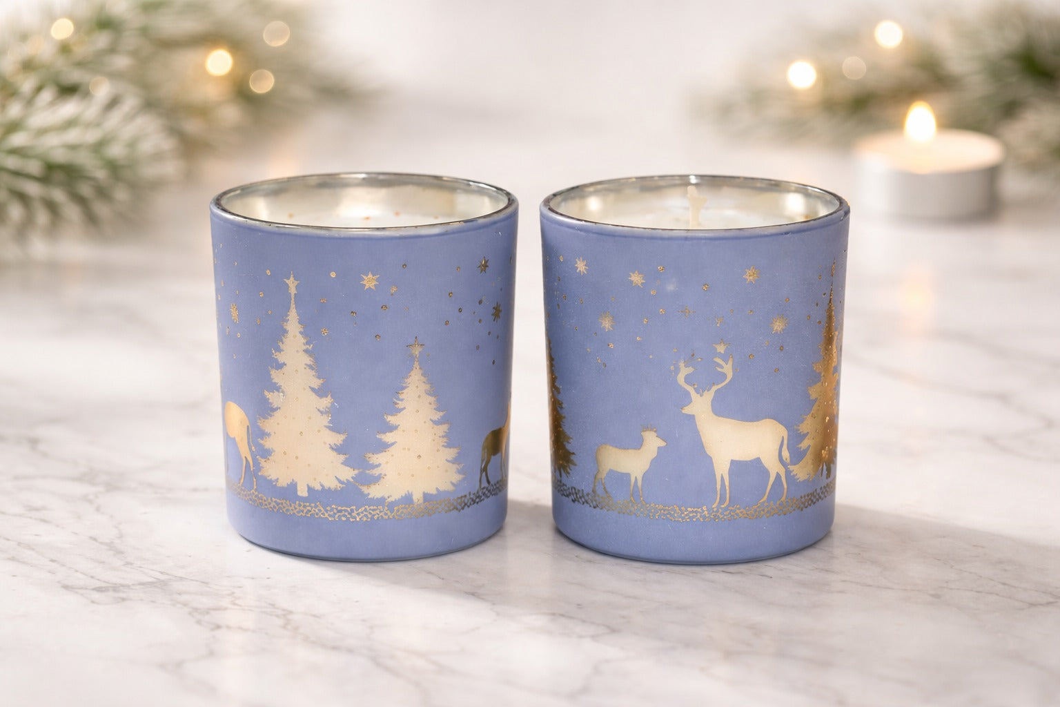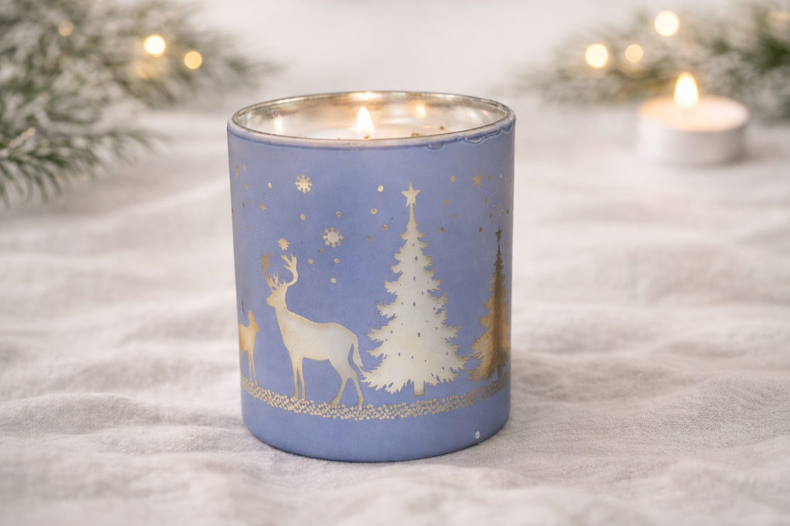 The jar features a luxurious mercury finish on the inside that creates a magical glow when lit, while the outside showcases a soft light-blue colour adorned with Christmas trees, reindeer, and delicate snowflakes—perfect for adding a festive touch to your space.